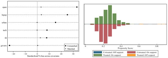The PSM-DID model is used to address any selection bias in the pilot policy by conducting robustness tests on the baseline regression results. This work utilizes one-to-four nearest-neighbour matching, radius matching, and kernel matching techniques. Subsequently, the double-difference model is employed for estimation based on the matching findings. Figure 5 displays the results of the balance test for radius matching; the left graph shows that the data after matching are all within 10% bias, and the right figure is a bar chart of the common support domain, indicating that the matching effect is better. Other matching methods also successfully passed the balancing test.