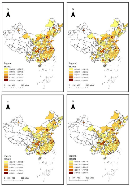 This paper used ArcGIS software 10.8.1 to visualize and analyse the ecological toughness of China’s cities in 2010, 2014, 2018, and 2021, and the results are shown in Figure 6. The minimum values of the ecological toughness of the cities in 2010, 2014, 2018, and 2021 were 0.043058, 0.056607, 0.066113, and 0.073275, respectively, and the maximum values were 0.641738, 0.683787, 0.740655, and 0.848814, respectively. On the whole, China’s ecological toughness has gradually improved, and the areas with higher ecological toughness are mainly municipalities and some cities along the coastal belt. In addition, according to the four-year spatial distribution map of ecological toughness, China’s ecological toughness level exhibited a clustering pattern, and most of the cities with relatively high ecological toughness levels were provincial core cities, while their development pattern tended to gradually diffuse from core cities to peripheral cities. In addition, as far as 2021 is concerned, 166 cities are located at the mean value of ecological resilience (0.1321992), which shows that the level of ecological resilience in China is relatively unbalanced.