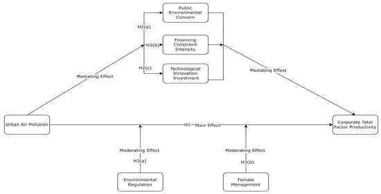 The detrimental effects of air pollution significantly influence corporate investment and financing decisions. Numerous studies have demonstrated that air pollution profoundly impacts the extent of the financial constraints faced by businesses. Through a cost management lens, Farooq et al. [28] applied a Generalized Method of Moments (GMM) model to assess how air pollution affects the investment behaviors of non-financial firms in BRICS countries. They found that increased air pollution leads to heightened compliance costs, which in turn impose financial restrictions on investment endeavors, thereby limiting firms’ capacity for risk-taking. Zhang et al. [35] observed that air pollution aggravates firms’ information environment and financial constraints due to information asymmetry, resulting in significant underpricing during initial public offerings (IPOs). On the other hand, considering green finance and governmental intervention in environmental preservation, Shen et al. [36] presented a contrasting perspective. They argued that acute air pollution exerts considerable environmental pressure on governments, prompting them to ease green financing thresholds for companies via green credit policies, thus aiding their ecological transition. Conclusively, we align with the view of Viet et al. [37] that the intense financial restrictions engendered by air pollution obstruct the improvement of productivity investments, subsequently diminishing CTFP. Therefore, we propose the following hypothesis.