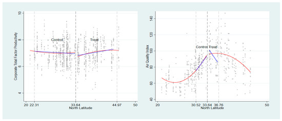 - We tackle the endogeneity problem by employing the “Qinling-Huaihe” River line as an instrumental variable. It needs to be emphasized that the “Qinling-Huaihe” River line is the geographical boundary between northern and southern China and the 0 °C isotherm in January. Therefore, the government implements a centralized heating policy for the north in response to the temperature difference between north and south. Li and Zhang [21] pointed out that there is little possibility of human manipulation in the implementation of a differentiated heating policy. Consequently, the “Qinling-Huaihe” River line can be considered an instrumental variable. Subsequently, we use a combination of the 2SLS and RDD methods to investigate the impact mechanism of urban air quality on CTFP.