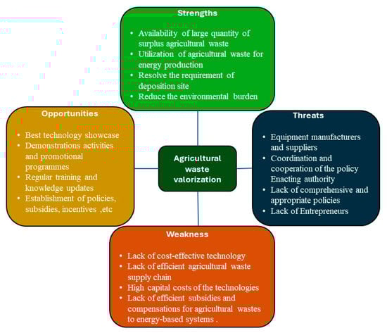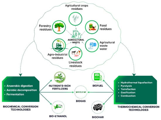 Despite the recognition that each agricultural waste valorization technology possesses unique attributes and utility, this review article emphasizes the overarching importance of the bio-refinery concept within an environmental context, focusing on mitigating the adverse effects of agricultural waste. This review aims to provide a comprehensive overview of environmentally friendly approaches to valorizing agricultural waste, considering bioenergy conversion and its applications in the agri–energy–environment sector. This highlights the interconnection between agriculture, energy, and environmental sustainability and the potential of the conversion of agricultural waste into bio-resources, contributing to a more sustainable future. (See Figure 1). Therefore, technologies for the biochemical and thermochemical conversion of agricultural waste into bioenergy are described. A summary of the process of conversion into different bioenergy products such as biogas, bio-oil, and biofuel is provided, in addition to the potential advantages of and challenges in different biomass conversion technologies. The review also highlights the potential of agricultural waste valorization to address the current energy demand while at the same time contributing to environmental benefits and greenhouse gas emission reductions and suggests some significant gaps for improvement for a more sustainable future of bioenergy derived from agricultural waste.