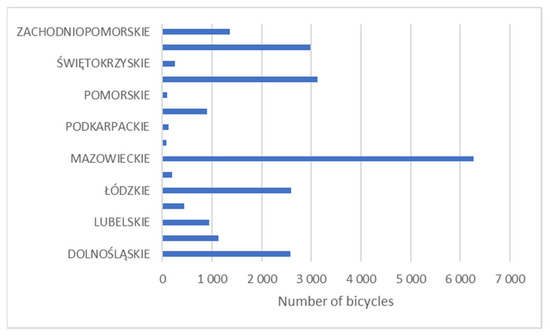 The number of bicycles in bicycle systems in individual voivodeships in Poland. Source: Own elaboration based on GUS data [53] (accessed: 5 January 2024).