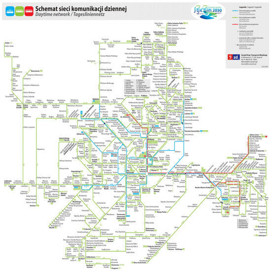 - Zarząd Dróg i Transportu Miejskiego. Available online: https://www.zditm.szczecin.pl/storage/network-maps/dzienne.pdf (accessed on 14 January 2024).