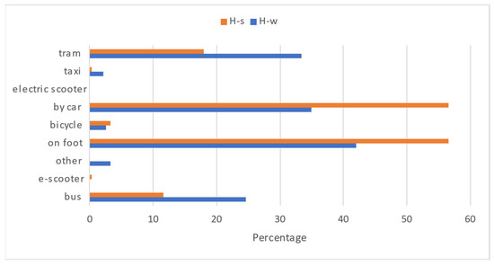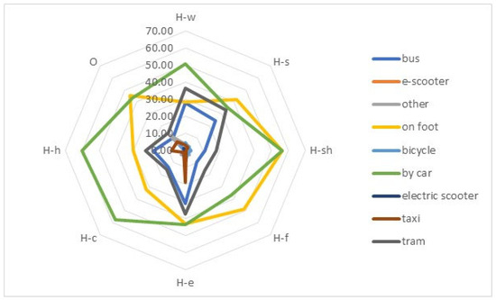 Overall, across all directions, the dominant modes of transportation are cars and walking [76], as illustrated in Figure 10, where the percentage of respondents choosing a specific means of transportation for the respective commuting direction is presented.