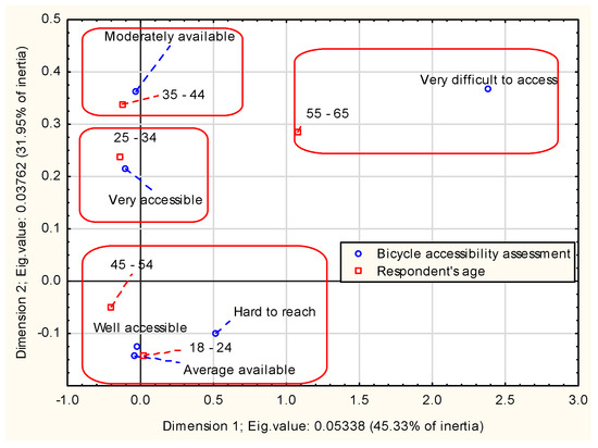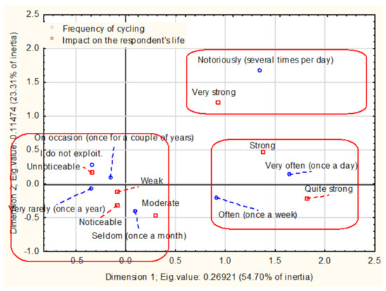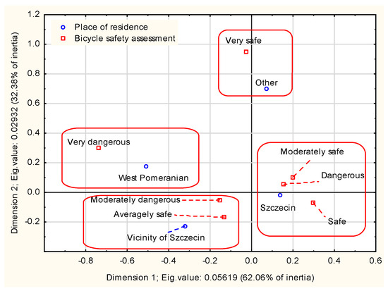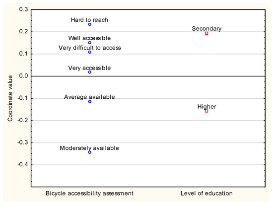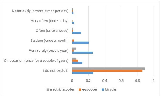 Based on respondents’ answers to questions regarding the frequency of bike usage, bike availability, safety of biking, and the impact of biking on their lives, connections between the characteristics of the chosen mode of transportation, in this case, a bike, and the characteristics of the respondents were identified. When asked about the type of transportation chosen by Szczecin residents for commuting to various places (Table 1) the role of bikes is relatively small. For example, 4.35% of respondents declared commuting to work by bike and 2.5% for commuting to school, as shown in Figure 9.