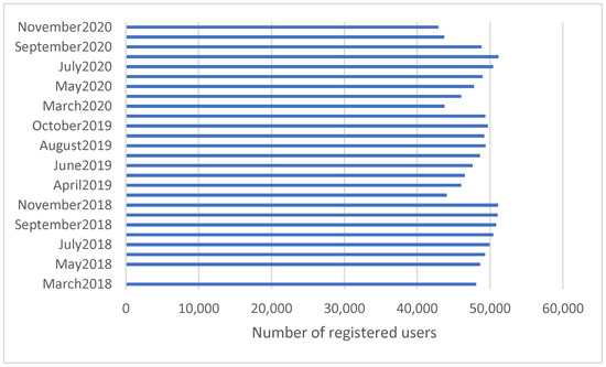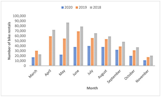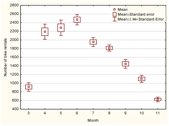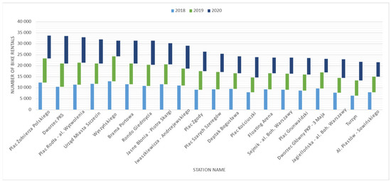 In terms of the number of bicycles, the order is noticeable: Warsaw—4951 units, Wrocław—2265 units, Poznań—1829 units. Szczecin ranks 6th with 830 bicycles. Similarly, the number of rentals for public bicycles is depicted in Figure 3.