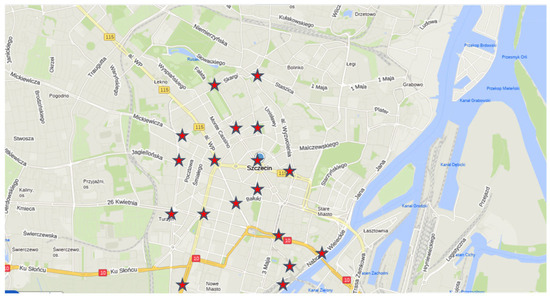Szczecin is the largest city in north-western Poland, situated in one of the countries bordering the Baltic Sea. It is home to approximately 401,990 residents [55]. Positioned near the Polish–German border at the mouth of the Oder River, its coordinates are 14°33′10″ E longitude and 53°25′44″ N latitude [56]. The city covers an area of 300.55 km2, with 1202.8 km2 occupied by water bodies. Its distinctive feature is its location on both sides of the Oder River, posing frequent transportation challenges for both residents and urban planners of city infrastructure. The public transportation network and city bike stations are depicted in Figure 5 and Figure 6.