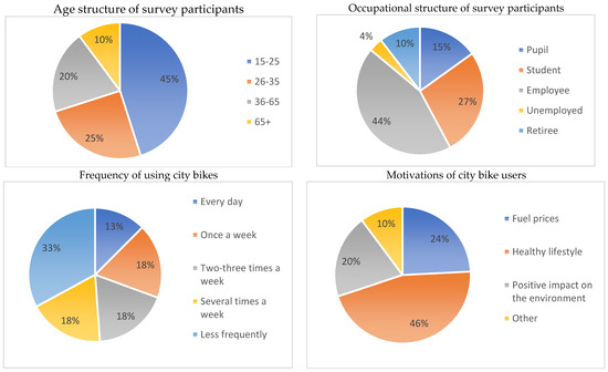In the fifth stage, to determine the current situation of bikesharing in Szczecin, its weaknesses, and directions for development, a brief survey II was conducted among SRM users on 11–12 December 2023. It consisted of two metric questions: “In which age group do you belong?” and “What is your occupational activity?” Additional questions included: “How often do you ride a bike?” and “What factors influence your decision to ride a bike?”. A total of 345 respondents aged 15 to 80 participated in this study.