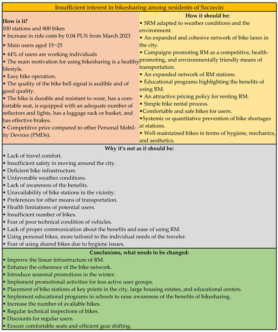 During this stage, a meta plan [75] was also developed for the issue: “Too little interest in bikesharing among Szczecin residents”. The meta plan involved gathering input and insights from participants to address and discuss potential solutions or improvements related to the identified problem.