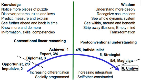 These notions indicate that it is not only that individuals in earlier stages (like nearly all students in K12) cannot yet impart the above-mentioned paradigms, but what is more, they have no capacity to really understand it. The same problem might appear for adults, as Binder’s collection of partly representative studies on the distribution of ego-levels shows; only 7 to 17% of adults are in post-conventional stages of ego development [25]. To change education towards these personal development goals (vertical development [27]) would necessitate fundamental changes in educational systems. At the moment, education in most countries seems to be concentrated mainly on competencies/employability [28], which is also labeled as horizontal development [27]. Interestingly, to change the focus towards personal development does not contradict the development of skills or employability; it was shown that students at a later ego development stage have better academic results [29] and individuals at a later stage are more successful leaders in companies [25]. Also, human resource managers complain that students in schools are not learning what are described to be middle- or late-stage propensities [22]. It seems like focusing on vertical development in education would prove to be helpful in every direction.