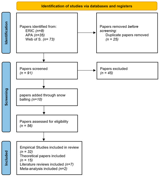 In 2020, the search parameters returned 116 potentially relevant articles from the databases. The inclusion criteria were papers that focused on sustainability, morality in relation to sustainability, or morality in general (as we see acting sustainably as a moral issue). Papers about morality in specific situations not related to sustainability were excluded, such as academic dishonesty, as were papers that had neither moral choices nor sustainability as the focus. Theoretical papers were deliberately not excluded because they turned out to point to several empirically relevant factors that the empirical papers did not cover (see inclusion criteria for the extracted factors). The inclusion and exclusion criteria for the papers were reviewed by two researchers independently through reading the abstracts and scan-reading the articles. All researchers agreed fully on the final selection. In some papers, references to further (meta-)analyses that promised to cover an even wider range of factors were found. Using the so-called snowball principle, the abstracts were reviewed and articles were scan-read. If they appeared to meet the inclusion criteria, they were added to the research corpus. The final corpus consisted of 56 articles. Figure 3 shows the article selection procedure (illustrated in the PRISMA scheme [37]).