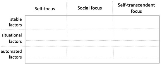 All of these factors are automatisms, as well as the two ambivalent factors in “focus on self”. Additionally, “automatisms” was the category where the most disagreement among the coders in terms of their focus happened. We see that automatisms tend to be rather undirected in their focus compared to stable and situational factors. This is also supported by the fact that they were most often used to manipulate the behavior of others. We think that in sustainability research and education, automatisms must therefore be treated with caution. Ignoring them does not seem to be an option; they appear to be very powerful and useful, as we have to assume that individuals deal with most conflicts—including those related to sustainability—in an automated way, mainly without recognizing it [31,32,33]. The notion that automatisms are important, but often unfocused, makes it necessary to revise the proposed TSS. We suggest including a bar at the bottom that collects undirected automatisms or provides a space to present the positions of the automatism (to which foci do they mostly lead?) more dynamically. If something similar were to be applied to the “situational factors”, it could also solve the case with the relict factor “perceived behavioral control” which is “a measure that captures to which degree people have the opportunity and ability to perform a certain behavioural alternative” [45] (p. 1029). If individuals have the impression of behavioral control (the choice, for example, to be able to use an alternative to driving by car), it positively influences sustainable action [38]. We see having a choice as not automatically leading to one of the three foci. Researchers as well as educators would have to assume that the non-designated factors are impactful but probably only lead to a certain focus in connection with other factors (as is depicted in [38,46]). The proposed revised version of the model is shown in Figure 4.