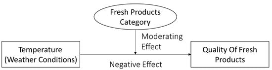 These studies underscore that the impact of temperature on spoilage and quality degradation vary among different types of fresh products, with specific temperature and humidity conditions affecting each category’s shelf life and safety. In this way, Figure 1 can be derived to plot the negative effect of temperature on the quality of fresh products based on existing research and common sense, while the mechanism of this effect receives the moderating effect of the fresh products category.