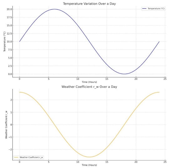 Diurnal temperature variation and associated weather coefficients for fresh food distribution logistics. Upper panel: a sinusoidal curve representing typical ambient temperature changes over a 24 h period. Lower panel: derived weather coefficients calculated through discrete differentiation of the temperature curve. Both visualizations were self-generated using Python by the authors for this study.