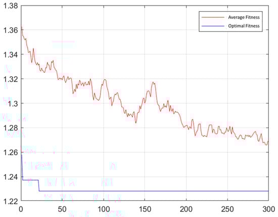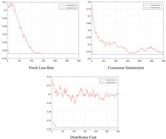 Using MATLAB_2021b, the algorithm parameters were meticulously determined through extensive iterative processes, resulting in a population size of 200, a crossover probability of 0.9, a mutation probability of 0.6, and a total of 300 iterations. These parameters were validated for their efficacy and appropriateness in achieving optimal algorithm performance. After 50 algorithm runs, the average iteration time was 1.77 s, indicating high computational efficiency. Upon convergence, the optimal fitness value averaged 1.22822, demonstrating stable results and robust algorithm performance. The best scheduling yielded objective function values of 0.35 (fresh loss rate), 2.43 (consumer satisfaction), and 0.36 (distributor cost). Figure 4 and Figure 5 depict the convergence of model fitness and objective functions, with Table 7 outlining the optimal scheduling strategy.