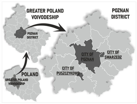 The geo-survey was conducted in three urban areas (two cities and one town) located in the Poznań agglomeration, namely in Poznań, Swarzędz and Puszczykowo (Figure 1). The most important criteria for the choice of the areas of study included: (1) the size of the unit, measured by the number of inhabitants, (2) population density and (3) the character of the city. The term “character of the city” is understood primarily as its functional and spatial structure, which has a most significant impact on the uniqueness of settlement units, as well as the dominant (economic) function of the center. In the context of the conducted research, within the functional and spatial structure, the most important elements include: residential development areas—their distribution, size, density (intensive—multi-family, extensive—single-family), type (single- and multi-family) and green areas—their system/layout in the city plan, location, size and type (including arranged and undeveloped areas). An additional selection criterion was also the location of the city in the agglomeration, as well as its administrative rank.