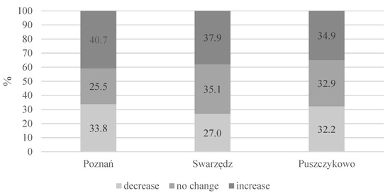 As a result of the pandemic, 39.1% of the residents experienced an increase in stress, 29.3% did not notice any changes in the stress level and 31.6% of the respondents stated that stress in the pandemic period decreased (Figure 2). Mostly, Poznań and Swarzędz residents suffered from an increase in stress levels (40.7% and 37.9%, respectively). In Puszczykowo, the lowest increase in pandemic-induced stress level and the related restrictions was observed. Such a distribution of responses may suggest a certain relationship between a stress level change and the city size, yet this was not statistically proven (Table 4). What was recorded, however, was a statistically significant correlation between a stress level change and the unique character of a city (Table 1). Poznań, the most populated city, saw the highest increase in stress levels during the pandemic (Figure 2).