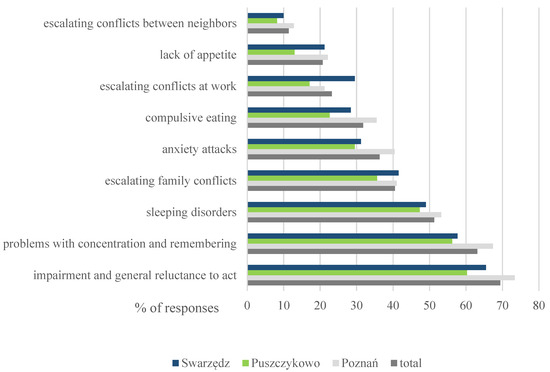 The residents of the analyzed cities indicated primarily the psychophysical aspects of their health deterioration as consequences of the experienced pandemic-related stress. Those were: impairment and a general reluctance to act (69.4%), problems with concentration and remembering (63.1%), sleeping disorders (51.3%), escalating family conflicts (40.5%), anxiety attacks (36.3%) and compulsive eating (31.8%) (Figure 3). They also included, but to a lesser extent, conflicts at work (23.2%), conflicts between neighbors (11.4%) and a lack of appetite (20.7%). Among the other consequences of long-term, chronic stress, the residents of the investigated cities mentioned most often: headaches, depression states, apathy and a general deterioration of their mental state.