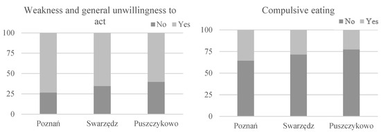 What should be noted is a significant difference regarding the stress effects experienced by the residents of the individual cities. The most negative results of stress by far were felt by the inhabitants of Poznań (the largest of the analyzed cities), as opposed to Puszczykowo (the smallest of the investigated centers, created on the basis of Howard’s garden city urban concept), which had the least adverse effects. Residents of Poznań indicated more frequently than the residents of the other cities a general impairment and reluctance to act (73.4% of the respondents) and problems with concentration and remembering (67.4%). Moreover, they experienced anxiety attacks and the need to eat compulsively much more often.