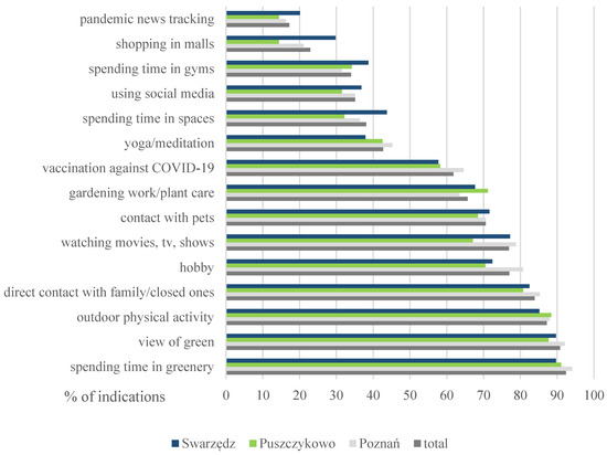 It has been observed that some methods of reducing inhabitants’ stress in the investigated cities during the pandemic depended on the character of a city and were related to their different spatiofunctional structures. They included spending time surrounded by greenery (in parks, gardens and green squares), in public places (among people) and shopping in malls or shopping centers (Table 8). The last two were most often indicated by Swarzędz residents and the least often by the inhabitants of Puszczykowo. Poznań dwellers most preferred spending time in the green to relieve stress, as opposed to Swarzędz inhabitants who chose this type of stress reduction the least frequently.
