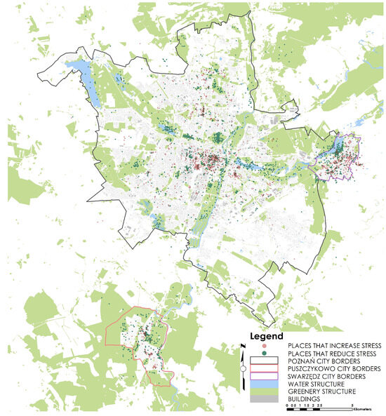 The focus is also on increasing and decreasing the impacts of spatial structure elements of cities of different sizes on the stress of urban dwellers during the pandemic. We assume that the larger the city, the more densely populated and more densely developed and therefore the higher the pandemic stress level; the same is true for the role of greenery in stress reduction. The answers to the posed research questions rest on the results of the geo-survey conducted. In-depth research was carried out in two Polish cities and one town that were different in size and situated in the Poznań agglomeration area—Poznań, Swarzędz and Puszczykowo.