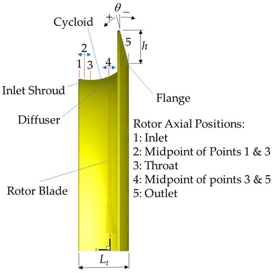 After validating the employed numerical procedure, diffusers will be introduced to enclose the rotor to form the DAWTs for subsequent evaluations under a wind velocity of U = 7 m/s. In this study, the diffuser profile of a cycloidal cure is used, following the recommendation of Ohya et al. [14]. The advantages of this implementation include the various inlet shrouds that will be introduced as the diffuser length changes, that various blade tip clearances will be introduced as the rotor axial position changes, and that various diffuser opening angles will also be introduced as the diffuser length and rotor axial position change. Adding an inlet shroud for the DAWT is recommended by researchers [29,35], who pointed out it can increase the approaching wind flow acceleration. Consideration of the tip clearance in the design of a DAWT is recommended by researchers [32,39], who point out that it is related to the aerodynamic and acoustic characteristics of the DAWTs. Diffuser opening angle was taken as a design parameter in studies performed by researchers [19,30,32,34], who revealed its significant effects on DAWT performance. In the summary of the papers surveyed, some key parameters regarding DAWT design have been collected, such as diffuser flange height/angle, diffuser profile/length/opening angle, rotor axial position, and blade tip clearance. The selected parameters adopted in this study are the diffuser’s flange height/angle, length, and rotor axial position, as indicated in Figure 1. After the cycloidal curve has been chosen as the diffuser profile, accompanied by the variations of selected parameters, the unselected parameters can also be included, and their effects can be involved. Table 2 shows the parameter ranges used in this study, specified according to the surveyed DAWT research works listed in Table 3. It can be found that the parameter ranges adopted all fall into the same order of magnitude as those used in other works. It is necessary to mention that the compact-type diffuser used by Ohya and Karasudani [14] was also utilized in this study to consider the structure’s strength.