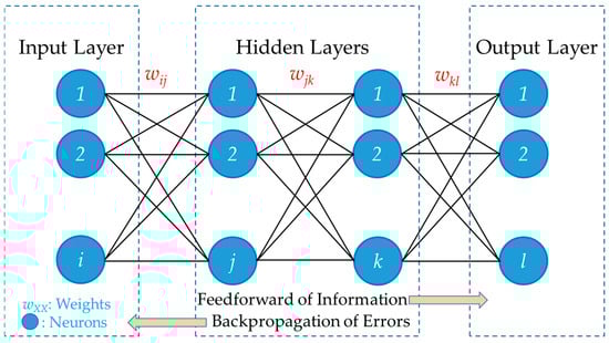 The BPNN is a supervised learning algorithm that can achieve the desired target output value by continuously adjusting the weights and biases of the network based on the error between the predicted output and actual output. Its architecture is shown in Figure 3, in which the network structure consists of input, hidden, and output layers, and it optimizes weights through the backpropagation algorithm, i.e., it learns by calculating the output layer’s errors to find the hidden layers’ errors.
