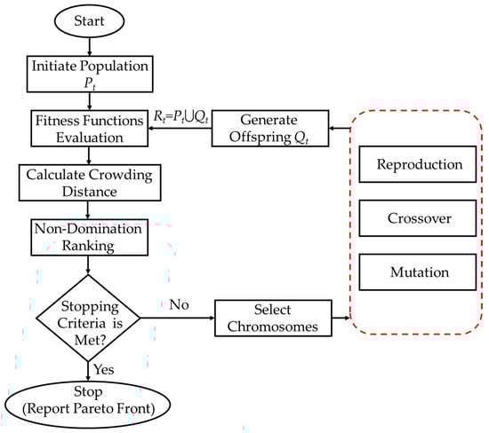 This study uses the NSGA-II algorithm proposed by Deb et al. [67], which is based on the concept of elitism, to conduct multi-objective optimization. The characteristic element of the algorithm is that the solutions in the solution set are sorted and grouped into non-dominated solutions, thereby forming several levels of Pareto fronts and adding the concepts of crowding distance and ranking to avoid falling into a local optimal solution and reduce computational complexity. The process of NSGA-II is roughly the same as that of traditional genetic algorithms. It requires basic operation steps such as selection, crossover, and mutation to generate offspring populations and join them with the parent, perform non-dominated sorting, and calculate the crowding degree of the parameters at the non-dominated level. Finally, based on the non-dominance relationship and crowding degree, the better chromosomes are selected to enter the next generation until the stopping criteria are met. The flowchart of NSGA-II is shown in Figure 4.