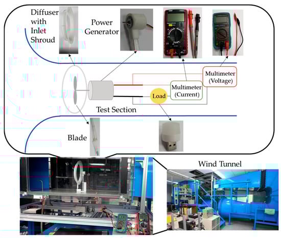 In this study, 3D printing is used to establish a series of scaled-down basic and optimized DAWT models with a scale factor of 4/27 by considering the dimension of the wind tunnel test section, and wind tunnel experiments are conducted for effectiveness verification (Figure 5). The related equipment includes a power generator, electrical load, multimeters (current and voltage measurement), and the wind tunnel (including hot-wire speedometers, data acquisition systems, and experimental control software). For the experiments, the accuracies of the instruments used to measure the voltage and electric current are ±0.01 (brand/model: Pro’sKit/MT-1210) and ±0.025 (brand/model: ANENG/DT9205A), respectively. The following equations can be adopted to obtain the uncertainty of the measurement: