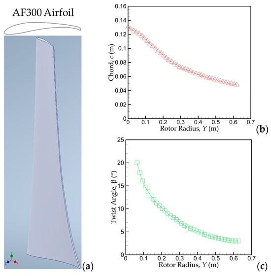 Schematic diagram of the rotor blade: (a) AF300 airfoil and constructed solid model; (b) chord distribution along the rotor radius; (c) twist angle distribution along the rotor radius.