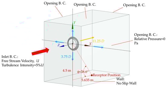 This research employs the CFD software ANSYS Fluent 2023 R2 to study the three-dimensional flow and acoustic fields. In this study, the SST k-ω turbulence model is used as a closure for the Reynolds-averaged Navier–Stokes (RANS) equations, for this model accounts for turbulent shear stress transport, exhibits good performance in near-wall boundary layers [35], and is reliable in predicting flow separation under adverse pressure gradients [34]. Thus, it gains a broad consensus as to its suitability for wind turbine applications [23,27,28,29,30,31,32,33,35]. For aeroacoustic simulation, the Ffowcs-Williams–Hawkings (FW-H) formulation is adopted, as it is the most general form of Lighthill’s acoustic analogy and is capable of predicting sound generated by equivalent acoustic sources such as dipoles and quadrupoles of the far-field noise, and then is commonly used to simulate the aeroacoustic noise emitted from shrouded wind turbines [38,39]. The governing equations, including the RANS equations, SST k-ω turbulence model [74], FW-H equation [75], and broadband noise source models [76,77], used for these simulations are listed as follows: