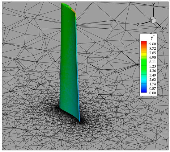 This study selects a two-blade design rotor proposed by Singh and Ahmed [72], which has lower construction costs and is suitable for low-wind speed applications. Its blade airfoil is an AF300, specially developed for low Re wind-turbine applications [78], as shown in Figure 6a. Figure 6 also displays the blade chord length and twist angle distributions of the rotor designed by Singh and Ahmed [72], which are used for constructing the blade solid model. The specifications of the rotor are presented in Table 1. The constructed rotor is placed in a size-verified computational domain (7D × 7D × 15D in x, y, and z directions, where D is the rotor diameter) with the origin located at the center of the rotor and its distance from the bottom ground is 4.5 m, as shown in Figure 7. The corresponding boundary conditions for the computational domain are also annotated in this figure. In addition, Figure 7 shows the receptor position for noise monitoring, where it is placed on the ground 5.635 m behind the wind turbine to comply with the international IEC 61400 standard [79], which specifies the angle between the line connecting the center of the wind turbine and the monitoring point along the ground is determined to be within 25° to 40°. A grid independence test proceeded, the predicted power variation was lower than 4%, and a grid number of about 9 × 106 was employed for the following simulations. Figure 8 displays the mesh distribution around the rotor blade and the corresponding y+ values, whose maximum value is lower than 10. The predicted turbine power of the BWT with design rotational speed (ω = 500 rpm) under various wind speeds (U = 5–7 m/s) is compared with the experimental data presented by Sign and Ahmed [72], as shown in Figure 9. It can be found that the order of magnitude and trend of the predictions are generally consistent with the experimental data but are slightly overpredicted. The reason may be that the numerical simulation does not consider the energy conversion losses of the generator, so the predicted values are somewhat higher than the experimental values.