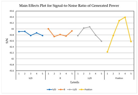 where MSD is the mean square deviation indicating the average quality loss, n is the number of experiments, and yi is the i-th experiment quality characteristics. Figure 10 displays the response graph of the SN ratio for the LTB analysis of DAWT-generated power. Consequently, an optimized parameter combination can be obtained, as shown in Table 5, and labeled as DAWT-Taguchil, alongside an original design labeled as DAWT-Origina. The original one is set as level 1 of the studied parameters for reference. Figure 10 also indicates that the impact of the rotor’s axial position on the power output is the most significant, followed by the diffuser length, flange angle, and flange height.