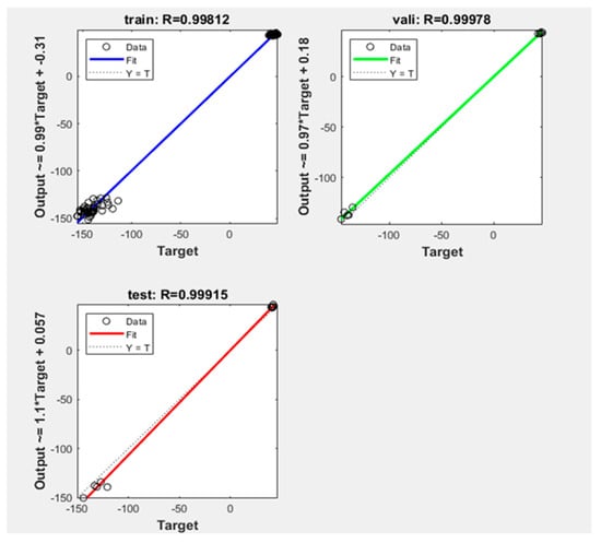 Based on the CFD results, Figure 11 displays the regression plot of the BPNN training, in which the input values are the design parameter conditions, the output values are the power and noise generated by DAWTs; it can be observed that the correlation coefficients R of the model training set, validating set, and testing set (the degree of fit of the data, the closer to 1, the better the degree of fit) are 0.99812, 0.99978, and 0.99915, respectively; all are greater than 0.99, which indicates that the overall estimation accuracy of the BPNN model is good.