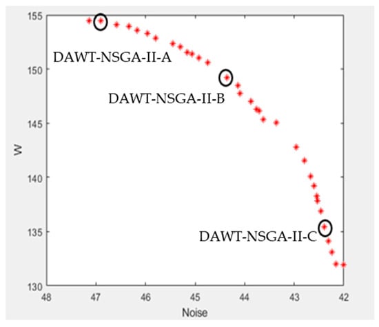 This study employs the NSGA-II algorithm on the MATLAB platform, in which the GA operators include intermediate crossover, Gaussian mutation with a 100 initial population, 0.8 crossover rate, and a 300 maximum-number-of-generations adopted. Take the trained BPNN model as the fitness function of the NSGA-II algorithm for multi-objective optimization, and then the Pareto front can be obtained, as shown in Figure 12. There are Pareto-optimal solutions along the Pareto front, and different ones are chosen for various goals and labeled as NSGA-II-A, NSGA-II-B, and NSGA-II-C, among which NSGA-II-A focuses on power output, NSGA-II-C focuses on noise reduction, and NSGA-II-B focuses on both to achieve a compromise. Their corresponding parameter combinations are also listed in Table 5. Table 6 displays the comparison of power and noise values predicted by BPNN and CFD for the cases after the completion of the multi-objective optimization, while the other cases (DAWT-Original and DAWT-Taguchi) are included in the datasets primarily used for constructing the BPNN model, and thus their predicted values are not available. It can be found that the maximum error is almost less than 3%, except for the noise prediction of DAWT-NSGA-II-C, which is overpredicted but associated with the correct trend; the accuracy of the BPNN model is acceptable.