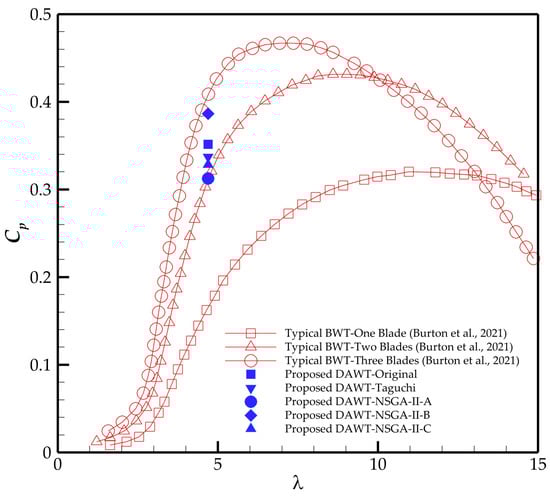 where pa is the atmospheric pressure, pb is the back pressure behind the diffuser, p2 is the pressure behind the rotor, u1 is the wind speed in front of the rotor, and U is the upstream wind speed. Watanabe and Ohya [31] indicated that the back-pressure coefficient is significant for the performance of DAWTs and pointed out that a lower Cpb and a higher Cpd are desired for a high-performance DAWT. In addition, Table 7 displays the tip clearance for various designs, and it can be found that its original value of 10 mm will change with the selected parameter combinations during the optimization process, as mentioned before. Table 7 also displays these tip clearance values as divided by the rotor radius, which fall within a reasonable range, as presented in the literature [32,39].