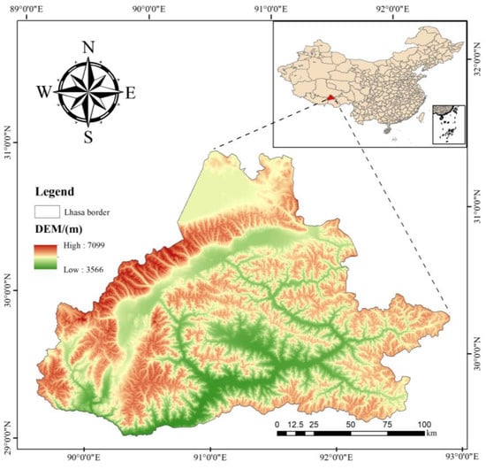 Lhasa is situated at the centre of the Tibetan Plateau (29°36′ N, 91°06′ E; Figure 2), covering an area of 29,655.5 km2. The plateau’s average altitude of 3650 m is relatively high, making it known as the world’s ‘third pole’. It is the provincial capital and economic cultural centre of the Tibet Autonomous Region. One of the tributaries of the Yarlung Zangbo River flows through Lhasa. This area not only has rich historical significance but also features scenic spots, making it abundant in tourism resources [43]. Within Lhasa, Potala Palace, Jokhang Temple and Norbulingka are listed as cultural World Heritage Sites.