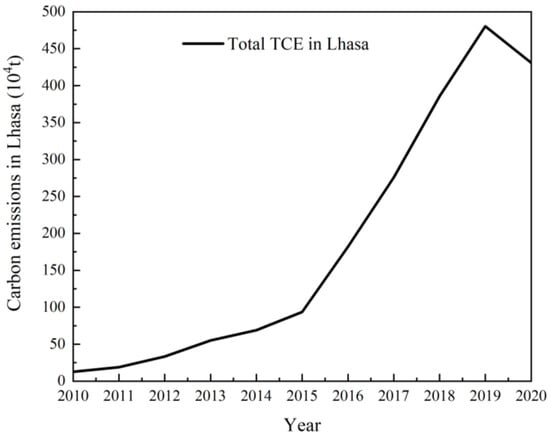 Using Equations (1)–(4) and the bottom-up estimation approach, the total TCEs in Lhasa were calculated for the period spanning 2010 to 2020. The results are shown in Figure 3. The total TCEs in Lhasa showed an upward trend followed by a downward trend. According to these trends, tourism development in Lhasa was divided into three stages: gradual (2010–2015), rapid (2015–2019) and declining (2019–2020).
