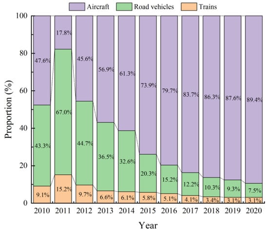 The proportion of TCEs from trains and road vehicles generally declined but the total TCEs increased. The TCEs from trains increased substantially, climbing from 0.094 million tons in 2010 to 1.325 million tons in 2020, with an average annual growth rate of 30.3%. Road vehicle TCEs also increased from 0.448 million tons in 2010 to 3.189 million tons in 2020, reflecting an annual average growth rate of 21.7%. The total amount of TCEs from aircraft was the highest and showed the largest increase, surging from 49.17 million tons in 2010 to 3814.44 million tons in 2020, an average annual growth rate of 54.5%. The TCEs per kilometre of trains, road vehicles and aircraft travel were 65, 132 and 396 g, respectively [68]. Aircraft TCEs were six-fold higher than train TCEs and three-fold greater than road vehicle TCEs per kilometre. Due to their convenience, aircraft are strongly preferred by tourists, and their use has increased in the last decade [69]; however, they are expensive and generate the most TCEs.