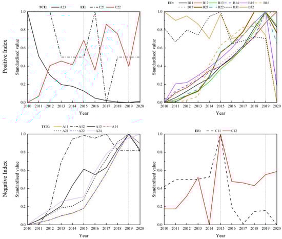 By analysing the changes in each index, the impact of the three subsystems—TCEs, ED and EE—on the progress of sustainable tourism development could be discerned. The indices were computed utilising Formula (7), and the outcomes are visually presented in Figure 5.