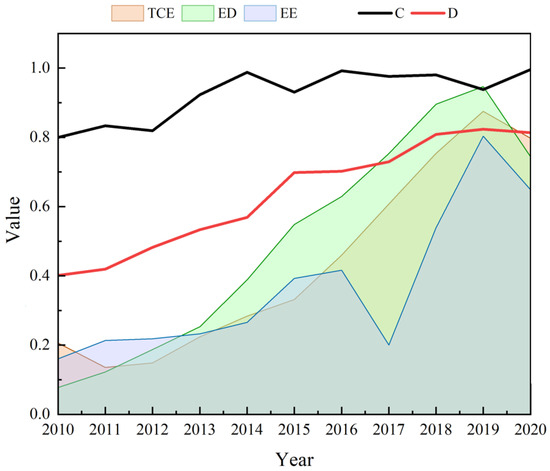 The coupling coordination model was applied to analyse the interactions among TCEs, ED and EE in Lhasa. As shown in Figure 6, from 2010 to 2020, there was an overall increasing trend in D among the three subsystems. The specific situation is described below.