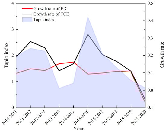 Decoupling refers to the relationship between the various parts of a system [65]. The decoupling theory intuitively reflects the dependence of ED on TCEs. The Tapio decoupling model is widely used across various fields due to its high stability and effectiveness in studying interconnected relationships among elements [66]. The decoupling of TCEs and ED was analysed using the Tapio decoupling model, as shown in Equation (12):