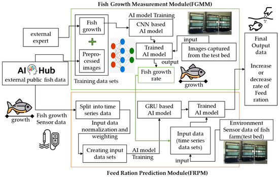 Firstly, the Fish Growth Measurement Module (FGMM) captures images of fish using an underwater camera and processes these images to generate a single fish image through cropping, resizing, and perspective correction techniques. The module then creates training data by associating the modified image with the corresponding fish growth level at the time of capture, forming a dataset for training a CNN-based neural network model. Once trained, this neural network model utilizes fish data to determine the degree of fish growth, transmitting this information to the feed ration prediction module.