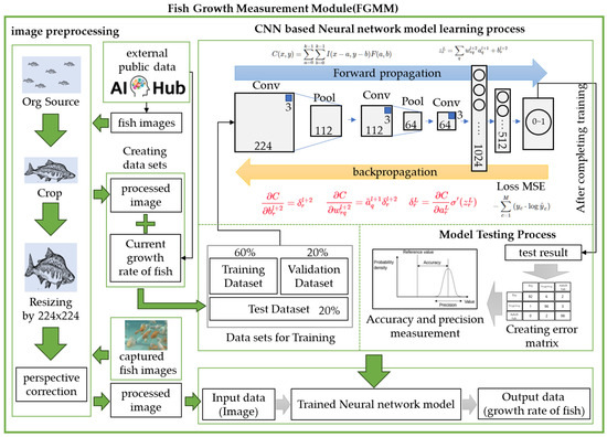 The Fish Growth Measurement Module (FGMM) undertakes two primary functions. Firstly, it performs image preprocessing, which involves retrieving images from JSON-based public datasets collected externally. It corrects the perspective of the acquired images, crops and resizes them, and refines the images to ensure they are suitable inputs for the neural network. Secondly, FGMM measures the growth stage of fish by employing the Growth-rate Prediction Neural Network (GPNN), a CNN-based neural network model. Upon completion of the learning process and confirmation of GPNN’s ability to accurately measure fish growth, the measurement data is transmitted to the Feed Ration Prediction Module (FRPM). Figure 2 illustrates the data flow within FGMM, encompassing the training and utilization of the artificial intelligence model.