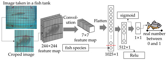 The data from the 7 × 7 feature map is then inputted as a row into the FC1 layer, which consists of 1024 nodes connected using the Fully Connect method. Additionally, a node capable of identifying fish species is added to the FC1 layer. The additional nodes are indicated in Figure 3 by red lines for distinction. The FC2 layer forms a fully connected layer with 512 nodes. The activation function of the FC3 layer is set to sigmoid to ensure the output value falls within the range of 0 and 1.