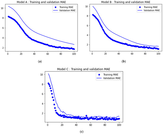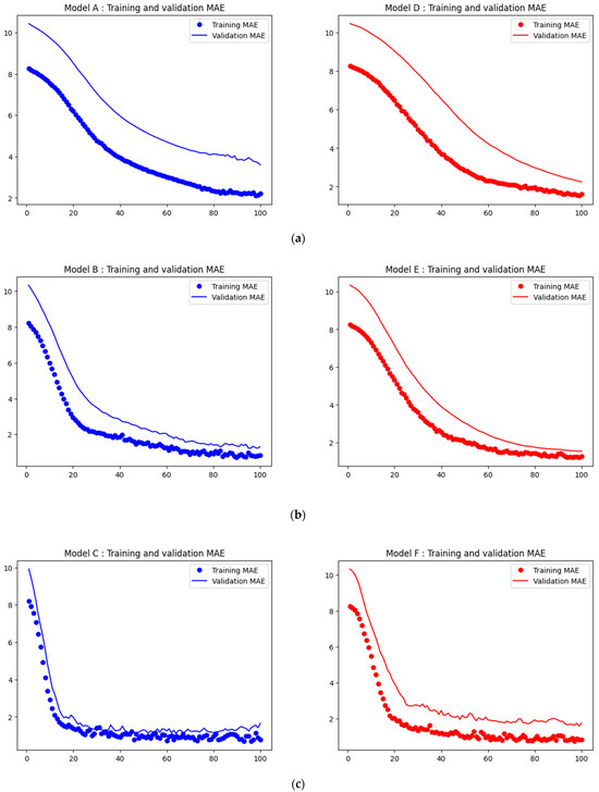 The simulation involved comparing the Mean Absolute Error (MAE) throughout the learning and testing phases of three distinct models with varying GRU connection structures. A larger MAE implies greater deviation between the model’s predictions and the actual values. The three models were configured by adjusting the GRU shape to 16 × 10, 32 × 16, and 64 × 48, respectively. Figure 7 depicts the results of the training and validation process for each GRU cell. The simulation was executed with identical specifications for the number of hidden layers, input layer, and output layer across all models. Key parameters of the simulation include: