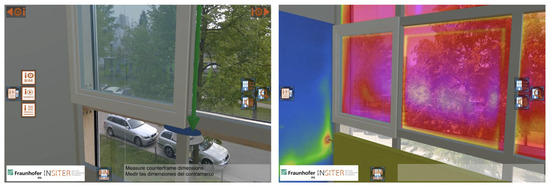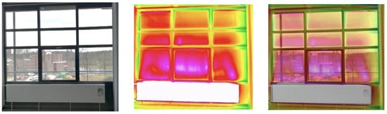 Figure 6. Inspection by thermal scanning image during the construction work. From the left: real picture of closed window; undistorted IR image of closed window; and overlapping closed window (Copyright 2018, H2020-INSITER Project Consortium Partnership).