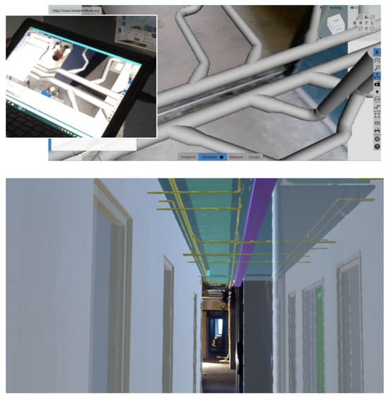- Step 7: Installation/replacement of the MEP systems in the building. Using BIM model to check accuracy. The installation has been followed by the placement of the sanitary and kitchen modules according to a manual from the manufacturer. The installation procedure has been checked with the BIM model for any discrepancies. After the installation started the self-inspection activity trough deployment of AR tool at the location where the MEP components are installed adopting this procedure: loading the BIM on a portable device (tablet); setting the positioning and orientation points for AR; visual inspection of the installation work using AR; and project AR overlay over the installed components/ducting to verify correct installation, course, and location (Figure 8).