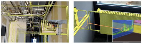 Figure 8. INSITER HoloLens BIM-based Mixed Reality App screenshots for self-inspection. The on-site demonstration centered on the heating system, with a focus on visualizing instrumentation measurement data related to thermal variations and heat dispersion of heating pipes (Copyright 2018, H2020-INSITER Project Consortium Partnership).