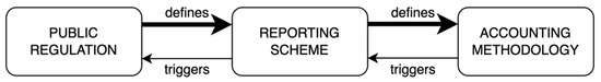 Linear, bi-directional relationship of public regulations, reporting schemes, and accounting methodologies.